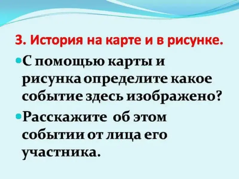 Учитель показывает карту и иллюстрацию к ней, дети определяют события и рассказывают о нём. Работает вся команда. Учащиеся сидят за круглым столом.