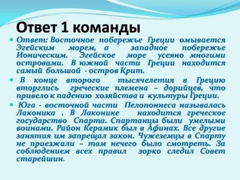 Ответ: Восточное побережье Греции омывается Эгейским морем, а западное побережье Ионическим. Эгейское море усеяно многими островами. В южной части Греции находится самый большой - остров Крит.