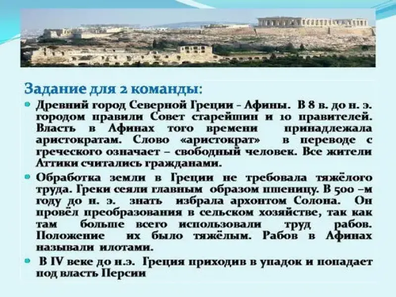 Ответ: Древний город Средней Греции- Афины. В 8 в. до н. э. городом правили Совет старейшин и 9 правителей. Власть в Афинах того времени принадлежала аристократам. Слово "аристократ" означает - знатный человек. Все жители Аттики, кроме женщин и приезжих, считались гражданами.