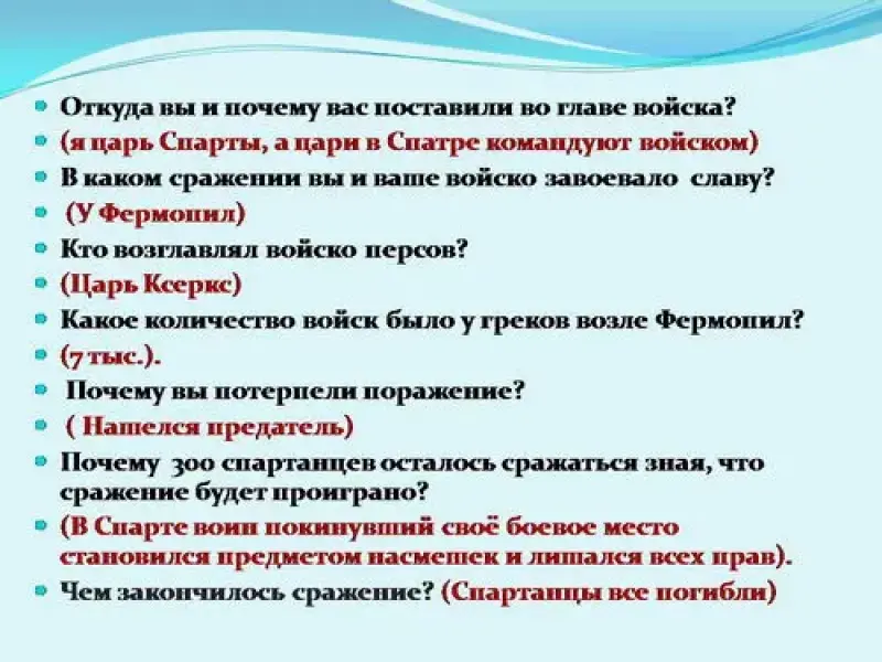 - Откуда вы и почему вас поставили во главе войска? ( Я царь Спарты, а цари в Спарте командуют войском).