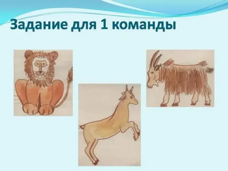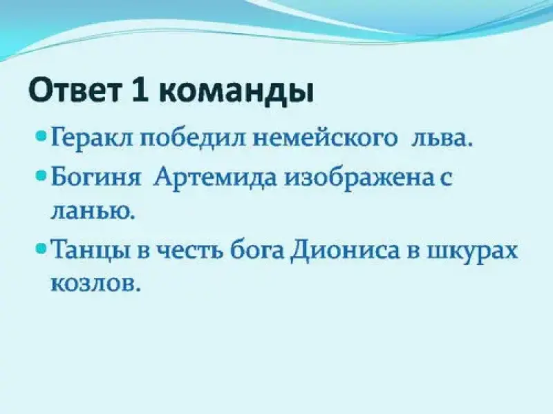 Задание 1 команде: Лев, лань, козлы. ( Геракл победил немейского льва, Богиня Артемида изображена с ланью, танцы в честь бога Диониса в шкурах козлов).