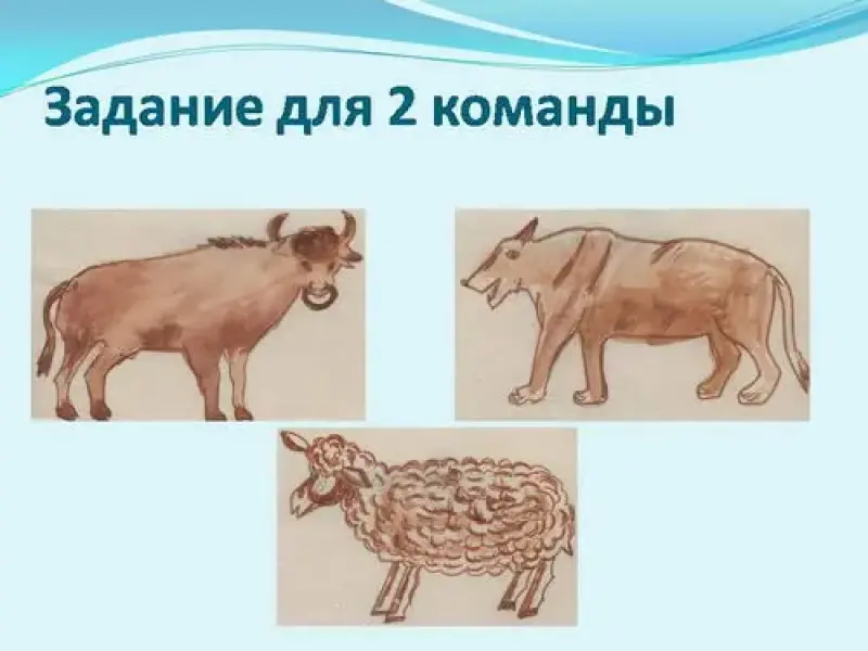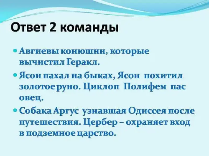 Задание 2 команде: Бык, овцы, собака. ( Авгиевы конюшни, которые вычистил Геракл, Ясон пахал на быках, Ясон похитил золотое руно, циклоп Полифем пас овец, собака Аргус узнавшая Одиссея, Цербер - охраняет вход в подземное царство).