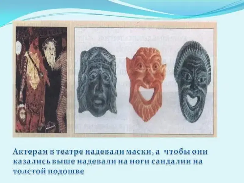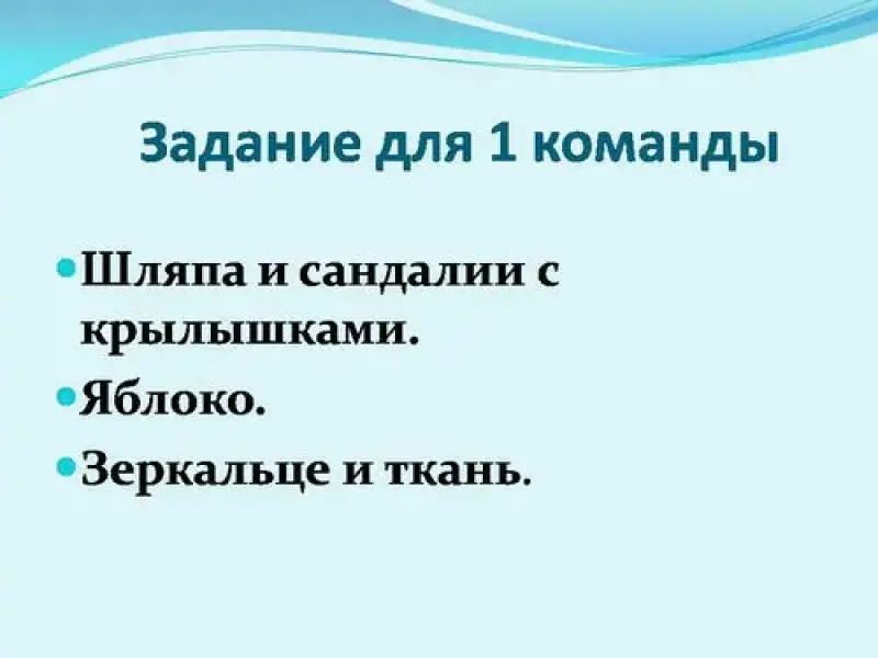 Задание 1 команде: Шляпа и сандалии с крылышками, яблоко, маски и сандалии на толстой подошве. (Богу Гермесу. "Яблоко раздора" - принадлежало богине ссоры. Эриде. Согласно мифу, она начала Троянскую войну. Актёрам в театре)