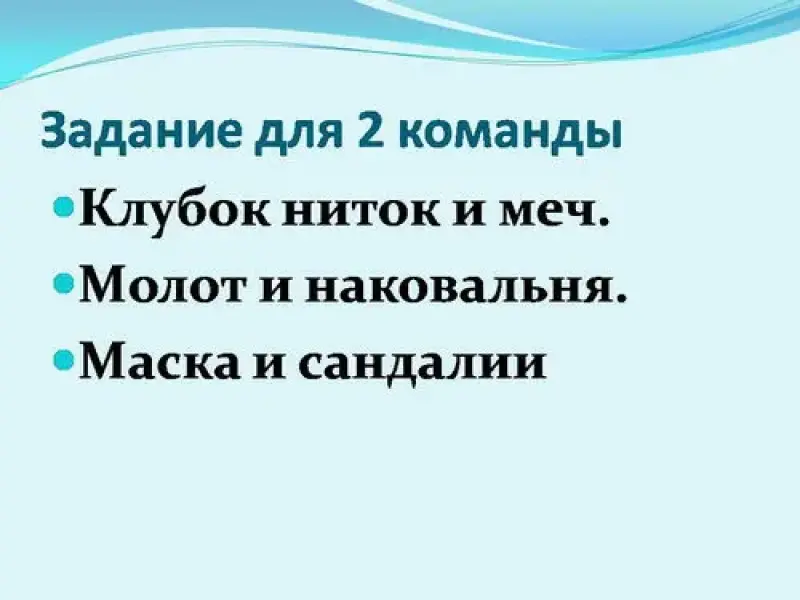 Задание 2 команде: Клубок ниток и меч, зеркальце, молот и наковальня.