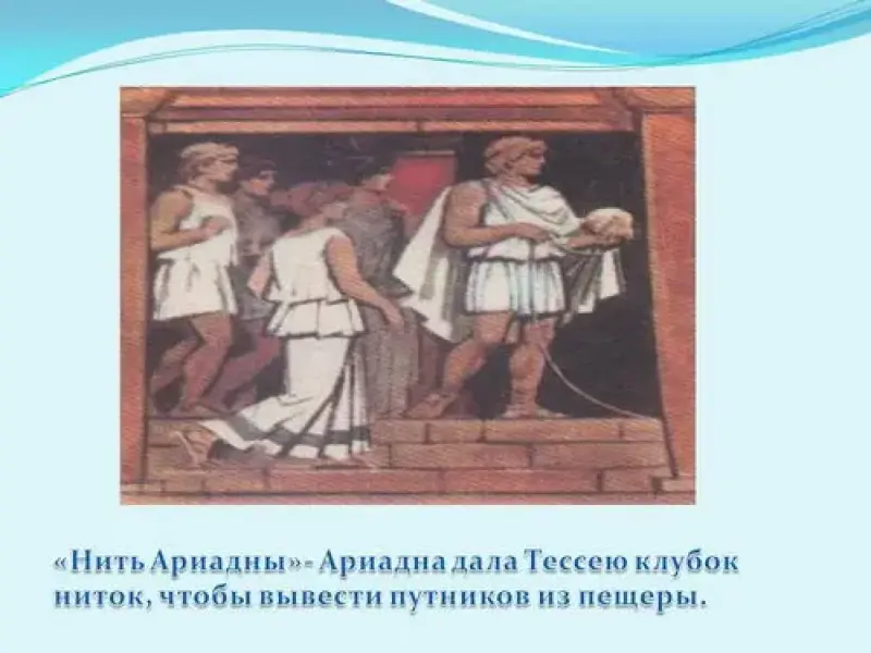("Нить Ариадны". Ариадна дала Тесею, чтобы он и его путники выбрались из лабиринта. Афродите - богине красоты и любви. Гефесту - богу кузнечного дела.)