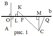 | Чему равно расстояние от точек А, В, С и К до прямой b? (Работа с рисунком №1) | от А до прямой b равно АО