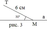 | Найти расстояние от точки Т до прямой а. (Рисунок №3) | Расстояние от Т до а равно половине гипотенузы ТМ, т. е. 3см. (катет, лежащий против угла в 30°) | ![]() |