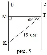 | Найти расстояние между параллельными прямыми с и b. (Рисунок №5) | Треугольник ТМК прямоугольный, угол МКТ равен 30°, тогда катет МТ равен половине гипотенузы, т. е. 9 см 5 мм. Расстояние между параллельными прямыми с и b равно 9 см 5 мм. | ![]() |