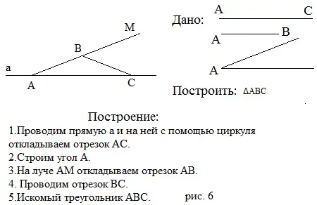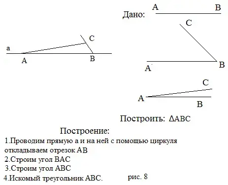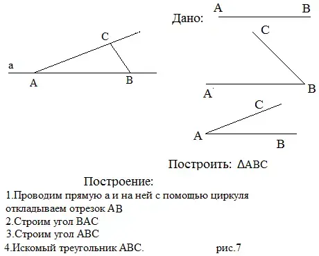 2) Далее учитель делит учащихся на группы и предлагает учащимся решить самостоятельно задачу №2 (Построить треугольник по стороне и двум прилежащим к ней углам).