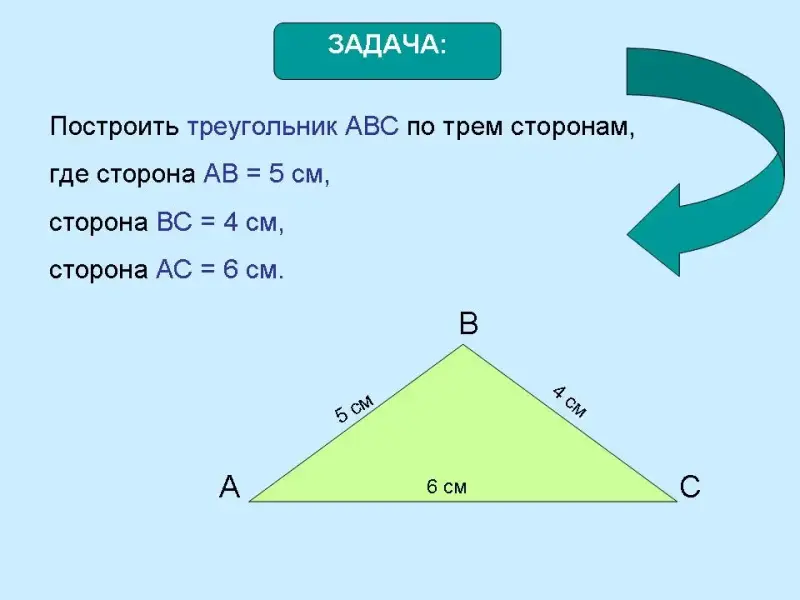 Цель: рассмотреть построение треугольника по двум сторонам и углу между ними; по стороне и двум прилежащим к ней углам; по трем сторонам; совершенствовать навыки построения геометрических фигур; развивать образное мышление.