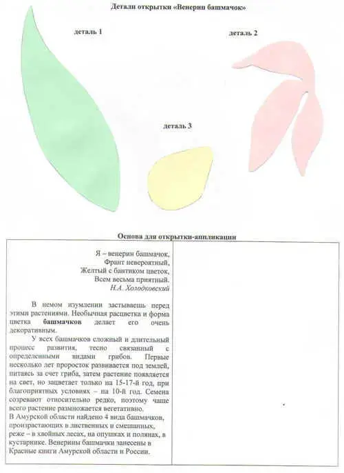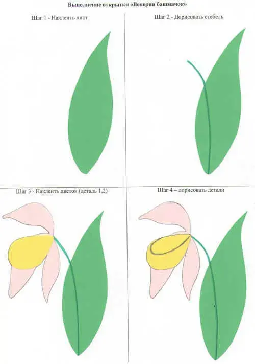 При выполнении открытки "Венерин башмачок" обратите внимание ребят, как нужно наклеить деталь: немного сместить вправо, нарисовать посередине; покажите, как должно получиться, используя пошаговые карточки <Рисунок10>.