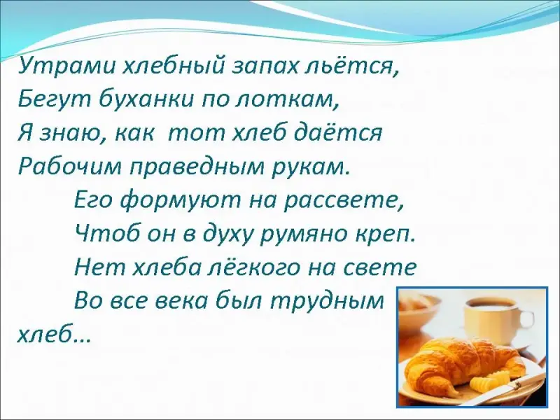 Много людей помогало ему (хлебу) в этом: и тот, кто пахал землю, сеял, убирал. И тот, кто потом хлеб молол, а потом испек. Трудно, тяжело достается хлеб. Хлеб кормит. Без хлеба нет жизни. Он занимает важнейшее место в жизни человека.