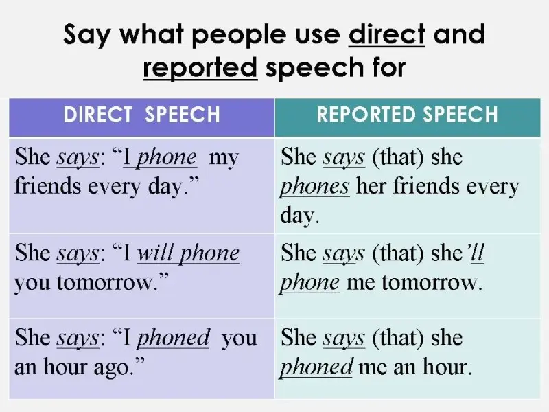 In the left column there are the sentences in the direct speech. In the right column they are transformed into the reported speech. Read the examples and compare. Say what people use the direct and reported speech for.