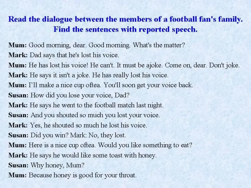 - Learn to define the reported speech. Read the dialogue (Слайд 3). Find the sentence with the reported speech. Read them one by one. (Dad says that he's lost his voice. He says it isn't a joke. He says he went to football match last night. He says he would like some toast with honey.)