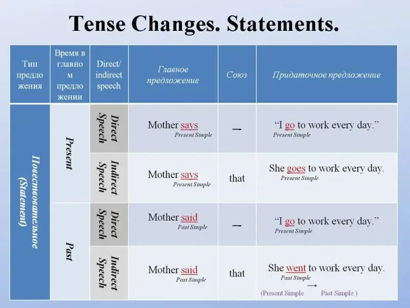 - Study the rule about changes that happen when we report someone's speech. Read and remember. At home prepare a table with changes: