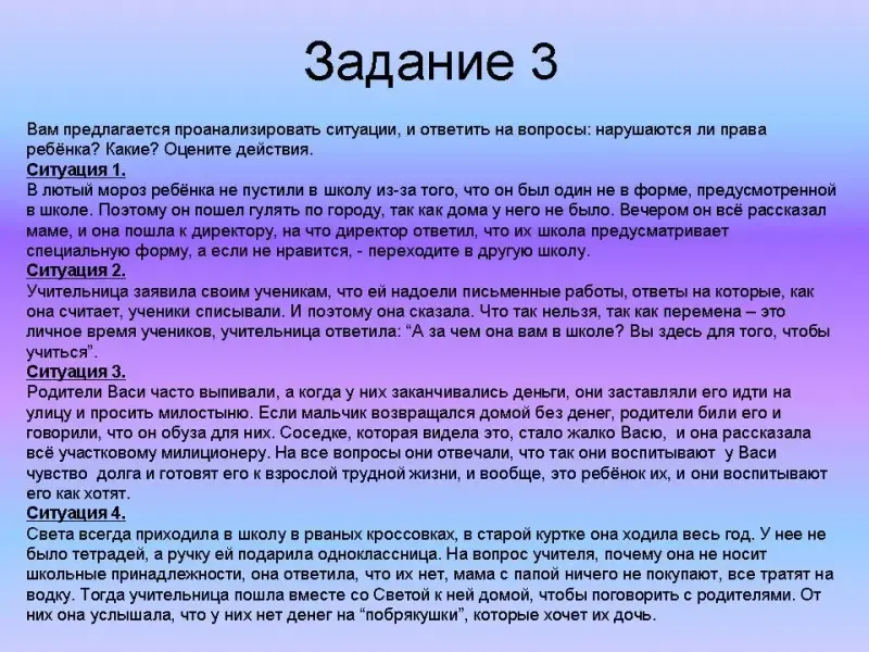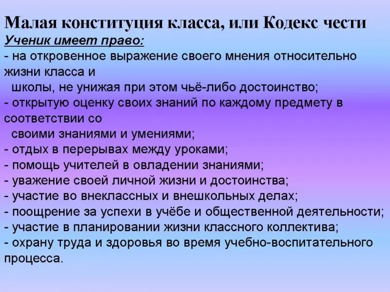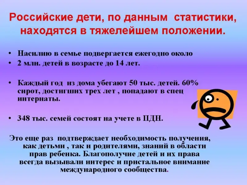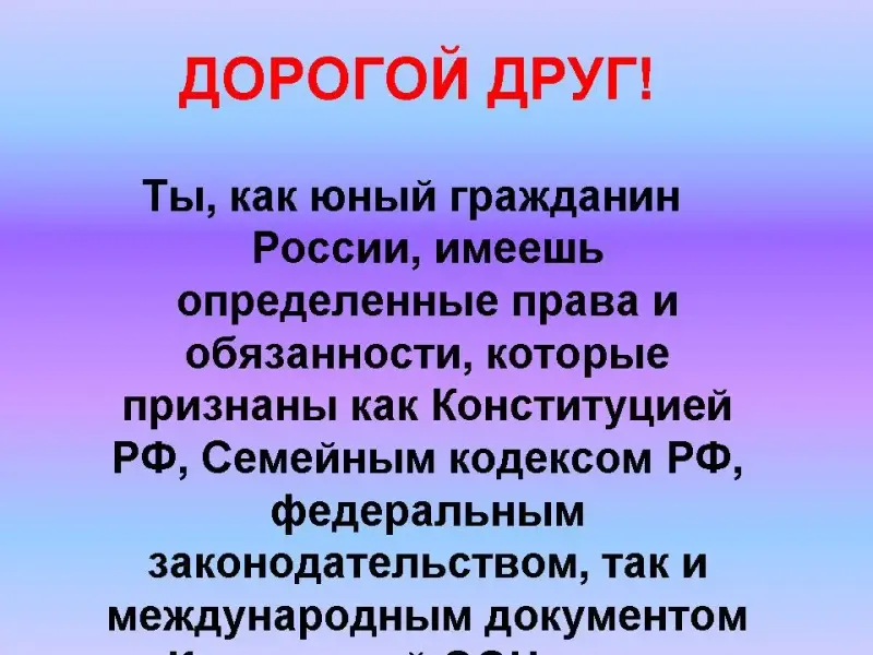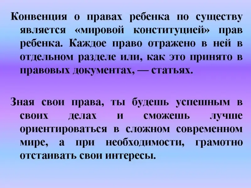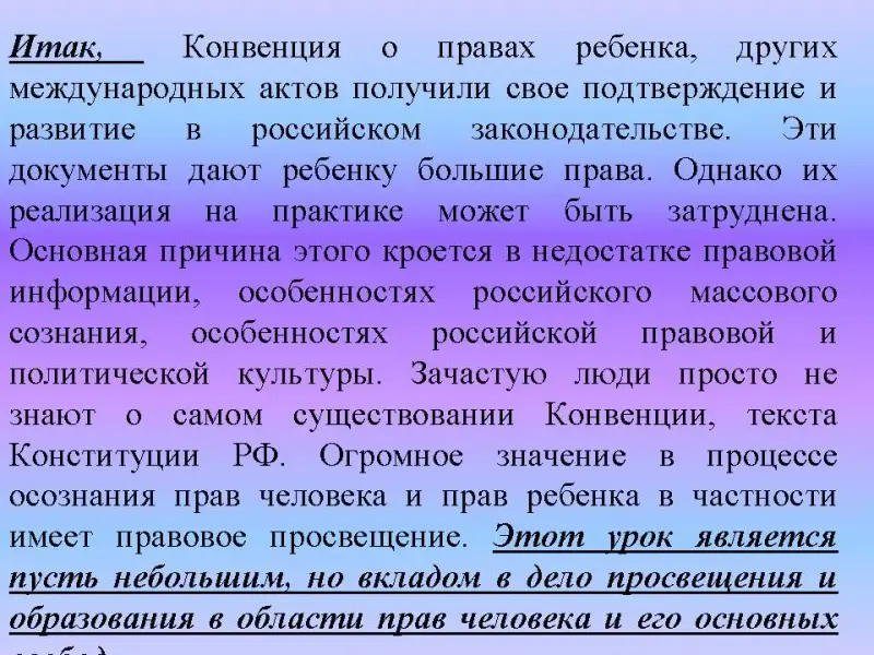Конвенция о правах ребенка, других международных актов получили свое подтверждение и развитие в российском законодательстве. Эти документы дают ребенку большие права. Однако их реализация на практике может быть затруднена. Основная причина этого кроется в недостатке правовой информации, особенностях российского массового сознания, особенностях российской правовой и политической культуры. Зачастую дети просто не знают о самом существовании Конвенции, текста Конституции РФ. Огромное значение в процессе осознания прав человека и прав ребенка в частности имеет правовое просвещение. Этот урок является пусть небольшим, но вкладом в дело просвещения и образования в области прав человека и его основных свобод.