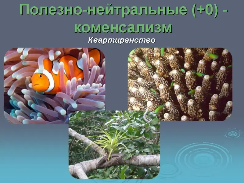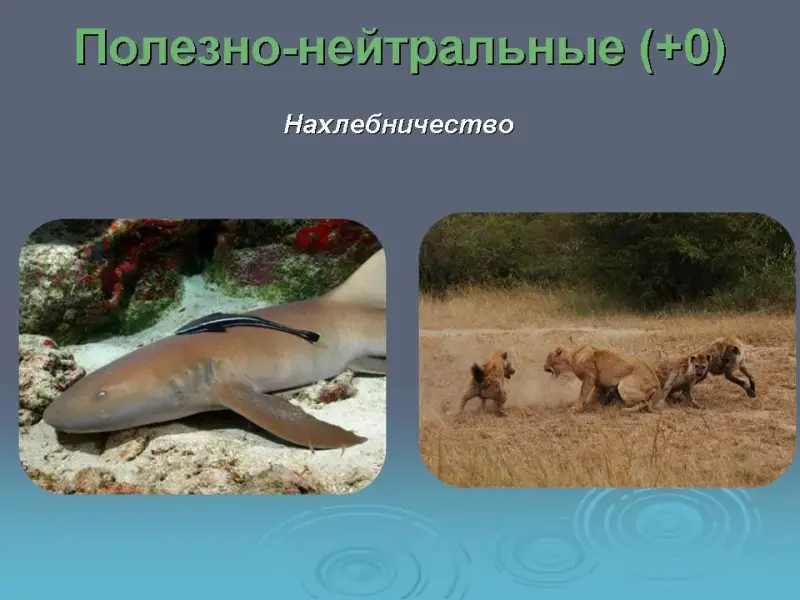 (Слайд 9) Комменсализм (+0) - тип взаимоотношений, при котором один из двух обитающих совместно видов извлекает пользу из совместного существования, не причиняя вреда другому виду.