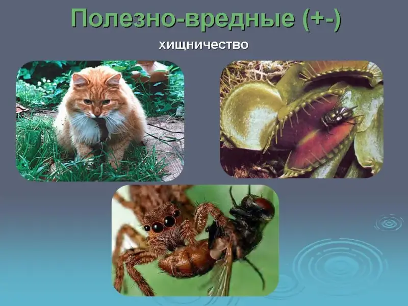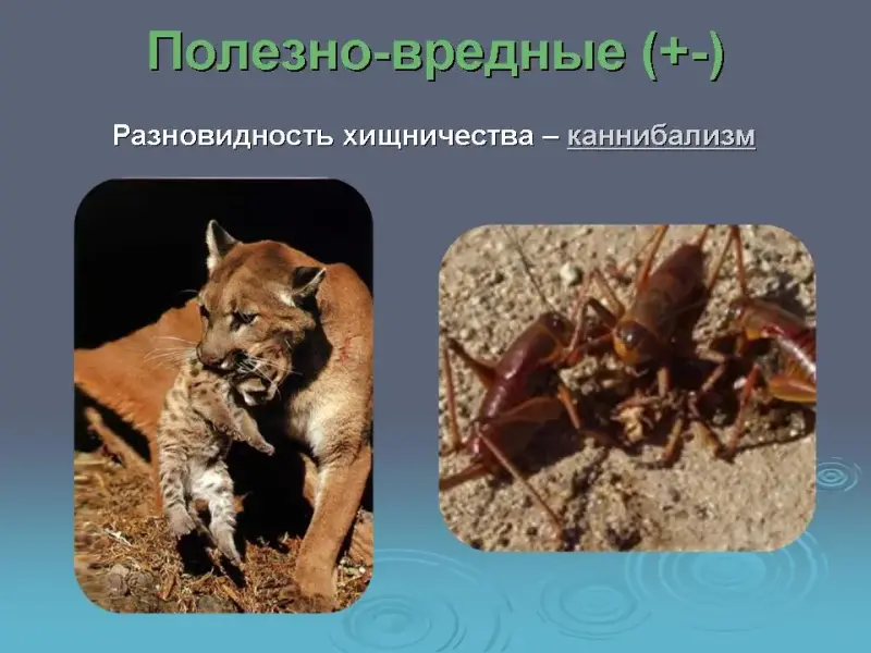 (Слайд 11,12) Полезно-вредные(+-) - форма взаимоотношений, при которой один из взаимодействующих организмов испытывает отрицательное влияние, а второй положительное. Существует два вида таких взаимоотношений.
