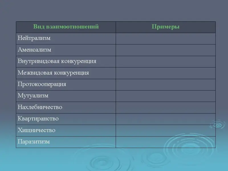 (Слайд 17) 1. Распределите пары организмов по типам взаимоотношений заполнив вторую колонку таблицы. Устно объясните свой выбор.
