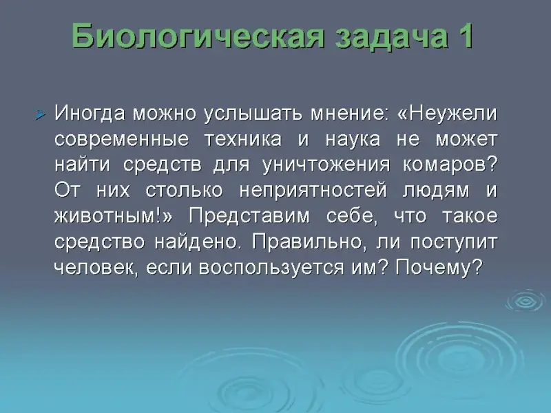- (Слайд 18) Иногда можно услышать мнение: «Неужели современные техника и наука не может найти средств для уничтожения комаров? От них столько неприятностей людям и животным!» Представим себе, что такое средство найдено. Правильно, ли поступит человек, если воспользуется им? Почему? (Неправильно. Комары занимают определённое место в цепи питания, сообществах организмов. Взрослыми особями, к примеру, питаются птицы, личинками и куколками комаров - водные животные. Полное уничтожение комаров повлечёт за собой необратимое нарушение цепей питания.)