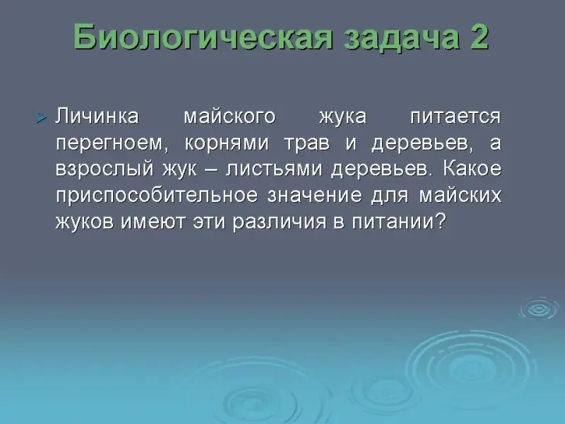 - (Слайд 19) Личинка майского жука питается перегноем, корнями трав и деревьев, а взрослый жук - листьями деревьев. Какое приспособительное значение для майских жуков имеют эти различия в питании? (Разное питание личинок и взрослых майских жуков уменьшает их конкуренцию за пищу, помогает выживанию вида)