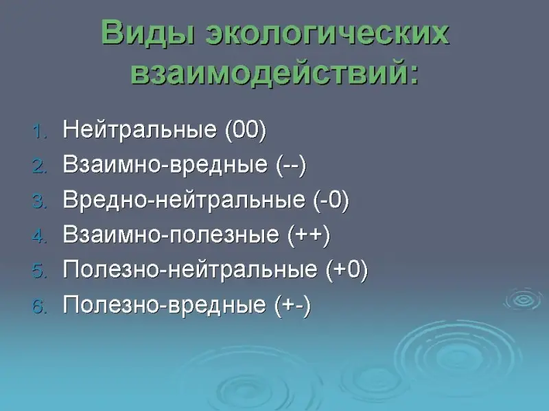 (Слайд 3) Нейтрализм (00)- тип отношений между видами, при котором они не формируют значимых форм воздействий. Виды, характеризующиеся таким типом взаимоотношений, не оказывают друг на друга заметного биологического воздействия.