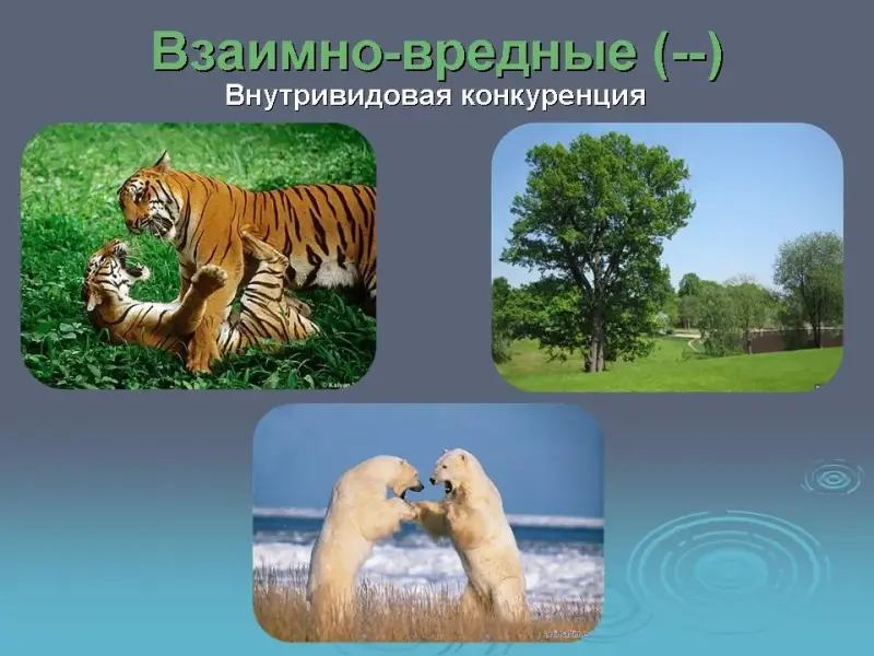 (Слайд 5) Межвидовая конкуренция - отрицательные отношения между двумя видами. Постоянно конкурируют между собой за пищу и жилье животные разных видов, например щука и окунь, волк и лисица, некоторые травоядные звери, кормящиеся на пастбищах, птицы, устраивающие гнезда в дуплах деревьев, и др. В отличие от растений конкурирующие животные часто пускают друг против друга в ход зубы, рога, когти, копыта, клювы.