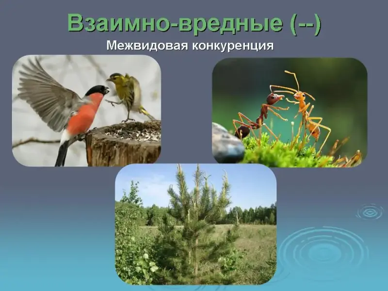 (Слайд 4) Конкуренция (- -) - это тип взаимодействий, который возникает, если у двух близких видов наблюдаются сходные потребности. Если такие виды обитают на одной территории, то каждый из них находится в невыгодном положении: уменьшаются возможности овладения пищевыми ресурсами, убежищами, местами для размножения и т.д.
