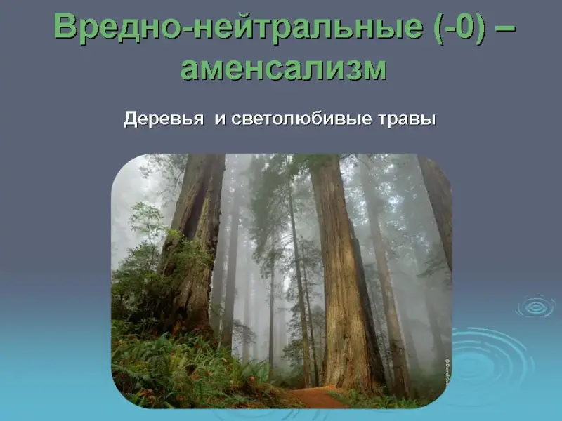 (Слайд 6) Аменсализм (-0) - для одного из совместно обитающих видов влияние другого отрицательно (он испытывает угнетение), в то время как угнетающий не получает ни вреда, ни пользы.
