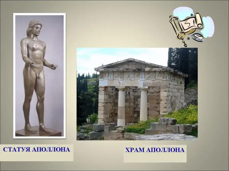 (Варианты ответов: Аполлон - древний бог Греции, покровитель искусства, поэзии, музыки. Бог света, бог- врачеватель. Сын Зевса и богини Латоны (Лето). Изображается с серебряным луком и золотыми стрелами, с золотой кифарой. На голове лавровый венок.