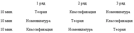 По истечении 10 минут помощники собирают выполненные задания у учащихся второго и третьего ряда и, согласно схеме, раздают задания на вторую десятиминутку. Учитель проводит опрос учащихся второго ряда. Через 10 минут происходит очередная смена деятельности.