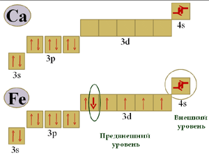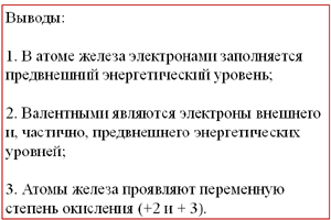 В атоме железа электронами заполнен предвнешний энергетический уровень, а именно 3d - подуровень. 2 электрона. Fe0 - 2e- = Fe+2 Могут. Записывают схему отдачи 3 - х электронов: Fe0 - 3e- = Fe+3 Записывают выводы:
