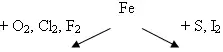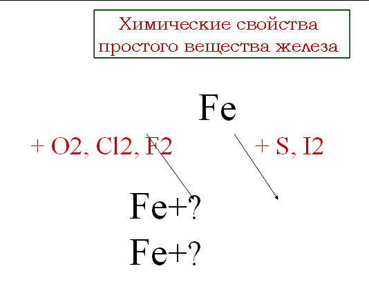 Б. ХИМИЧЕСКИЕ СВОЙСТВА ЖЕЛЕЗА Дадим характеристику химическим свойствам простого вещества железа. - По какому плану мы будем их изучать? - Перечислите простые вещества, с которыми железо вступит в реакцию. Называемые вещества делит на две группы. Записывает схему: