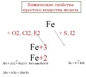 Записывают схему и вывод: степень окисления атома железа зависит от силы окислителя. Записывают уравнения реакций: 1) 3Fe + 2O2 = Fe2O3 · FeO или Fe3O4 (при нагревании)