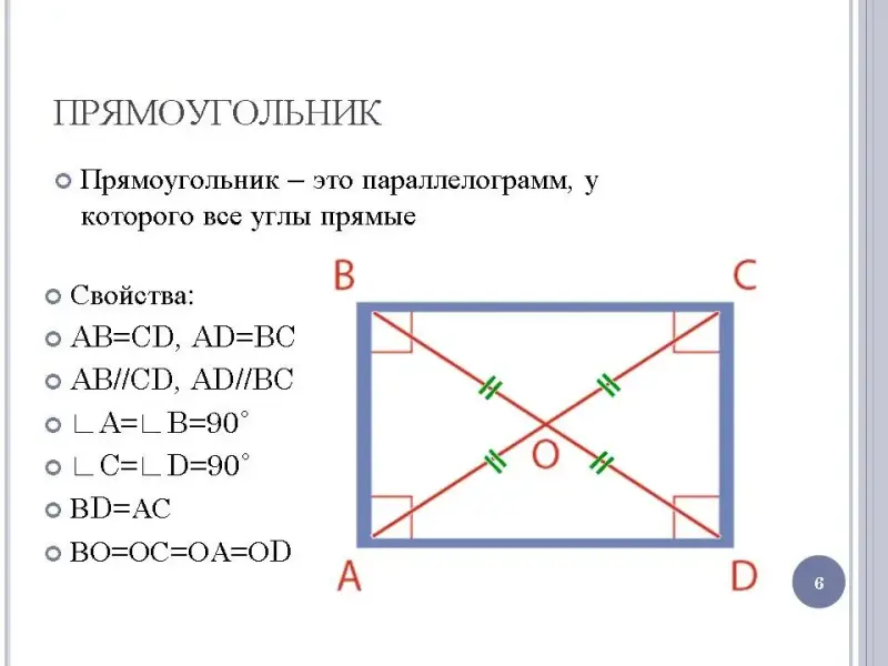 Учащиеся интуитивно чувствуют основные свойства прямоугольника, такие как равные прямые углы и равные противоположные стороны, и прекрасно видят их параллельность, поэтому особое внимание следует уделить новым свойствам, таким как равенство диагоналей и деление их точкой пересечения пополам.