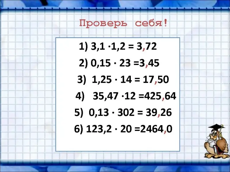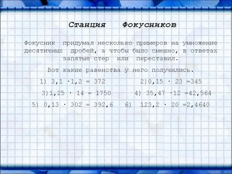 Фокусник придумал несколько примеров на умножение десятичных дробей, а чтобы было смешно, в ответах запятые стер или переставил.