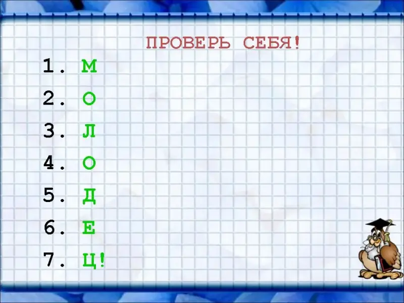 Вот и получили слово: МОЛОДЕЦ! (слайд 27)