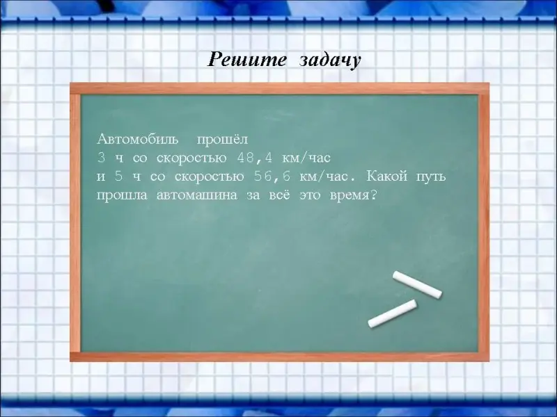 Автомобиль прошёл 3 ч со скоростью 48,4 км/час и 5 ч со скоростью 56,6 км/час. Какой путь прошёл автомашина за всё это время?