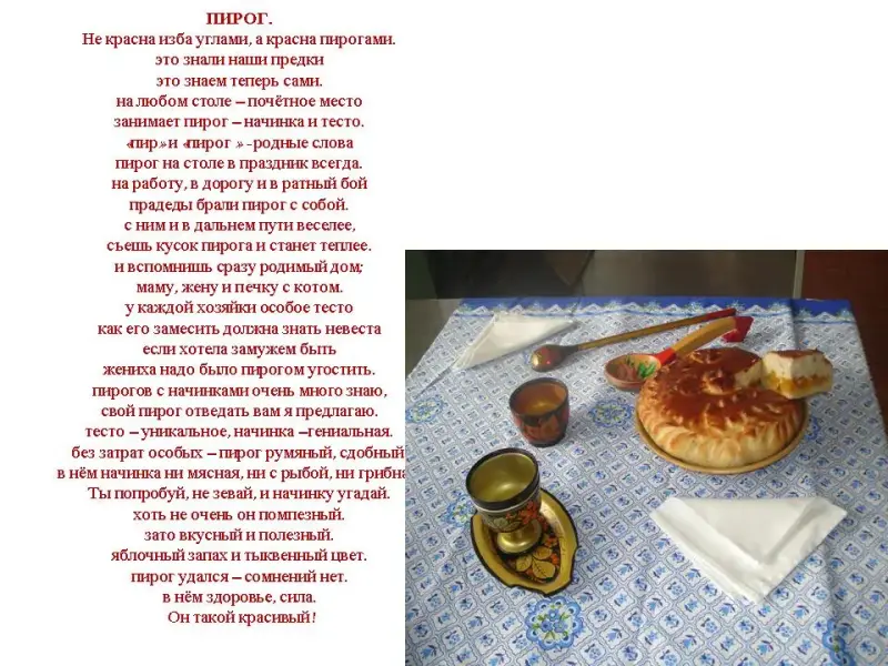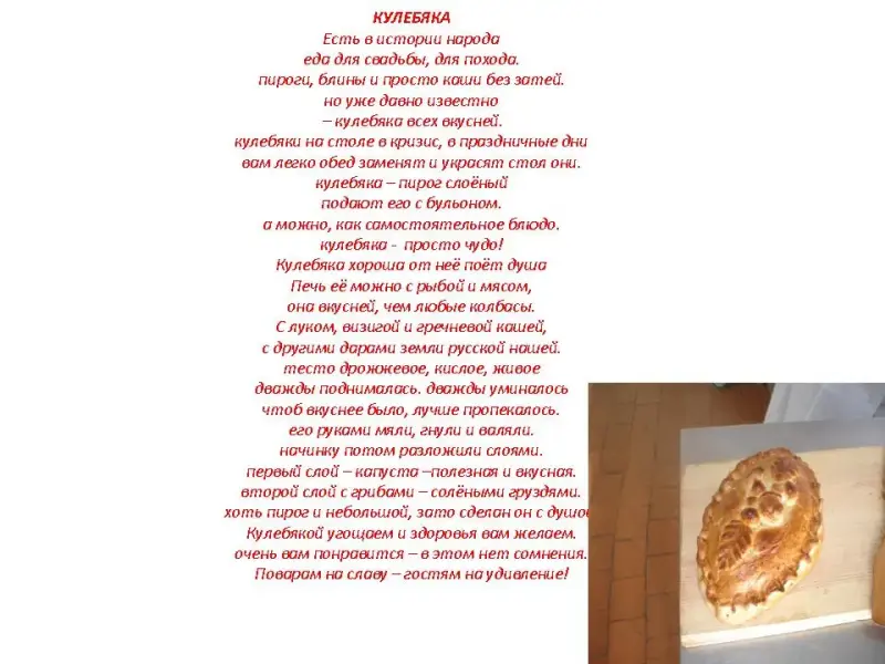 (зачитываю стихотворение про пироги и кулебяку, используя технологические карты, (слайды №1, 2, 8, 9) рассказываю технологический процесс замеса теста (слайд № 4, 11) приготовления фарша (слайд 4, 11), формования и оформления изделий (слайд 5, 6, 7, 12, 13, 14), а также пищевую ценность блюд (слайд №3, 10). |