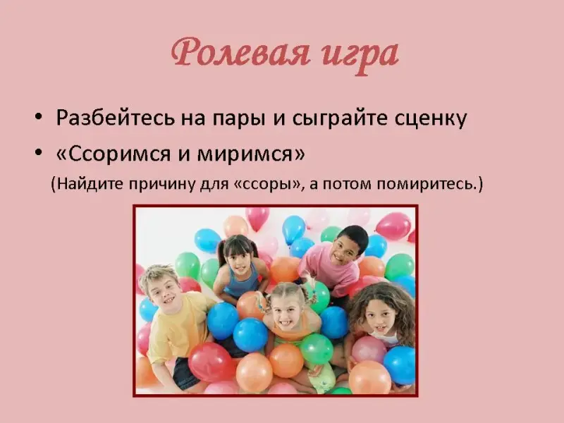 Разбейтесь на пары и сыграйте сценку «Ссоримся и миримся». Найдите причину для «ссоры», а потом помиритесь.