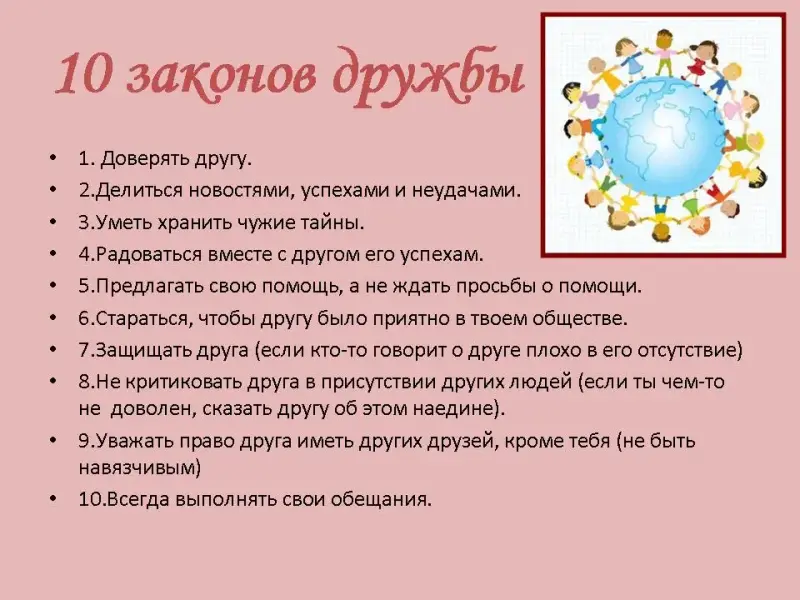 Учитель: Ученые-психологи изучали правила дружбы у народов разных стран. Оказалось, что, несмотря на разный цвет кожи, разное воспитание и условия жизни, есть много общего в том, что люди считают дружбой и дружеским поведением. Так были определены 10 законов дружбы.