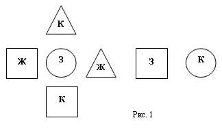 Дети охотно откликаются на предложение учителя поиграть с мозаикой. Игра им знакома, они уверены в своих силах и с увлечением выполняют задания вида: "Положите зеленый кружок, справа от него - желтый треугольник, слева - желтый квадрат, выше - красный треугольник, ниже - красный квадрат. За желтым треугольником положите зеленый квадрат, потом красный круг. Посмотрите на рисунок 1. Какая фигура следует за зеленым (цвет фигуры обозначен на рисунке первой буквой) квадратом, предшествует желтому треугольнику, находится между двумя зелеными фигурами? Посчитайте, сколько треугольников. Покажите цифрой количество зеленых фигур, всех фигур".