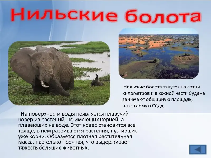 Болота. В Африке есть и переувлажненные участки, которые называют болота. Краткая характеристика болот. (15-16 слайды).