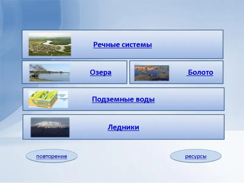 - Вспомнить уже известные и разобрать новые термины и понятия связанные с внутренними водами.