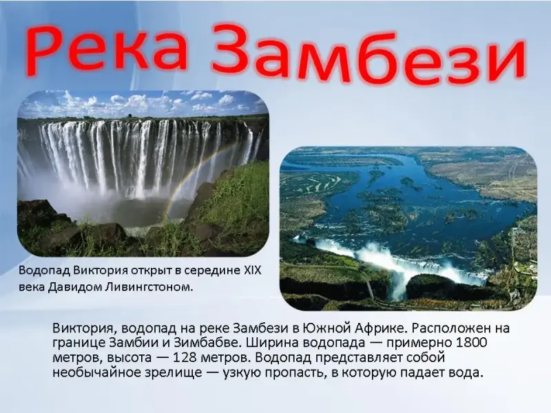 Длина Замбези 2736 км, площадь бассейна - 1330 тысяч квадратных километров, река берет истоки в Замбии, течет через Анголу по границе Намибии, Ботсваны, Замбии и Зимбабве к Мозамбику.