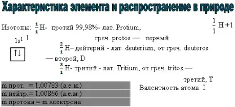 Водород - первый химический элемент периодической системы химических элементов Д.И. Менделеева. Атомный номер водорода - 1, относительная атомная масса равна 1,008. В ядре атома водорода один протон, масса которого равна 1 а. е. м. Почему же масса химического элемента водорода равна 1,008 а. е. м ? Масса не равна единице, так как кроме обычного водорода, называемого протий, существуют изотопы водорода с большей массой: дейтерий и тритий.