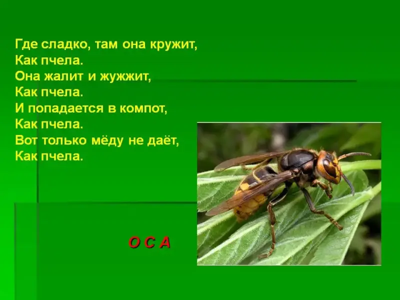 Как пчела. Она жалит и жужжит, Как пчела. И попадается в компот, Как пчела. Вот только меду не дает Как пчела. (Оса.) Необычный я усатик.