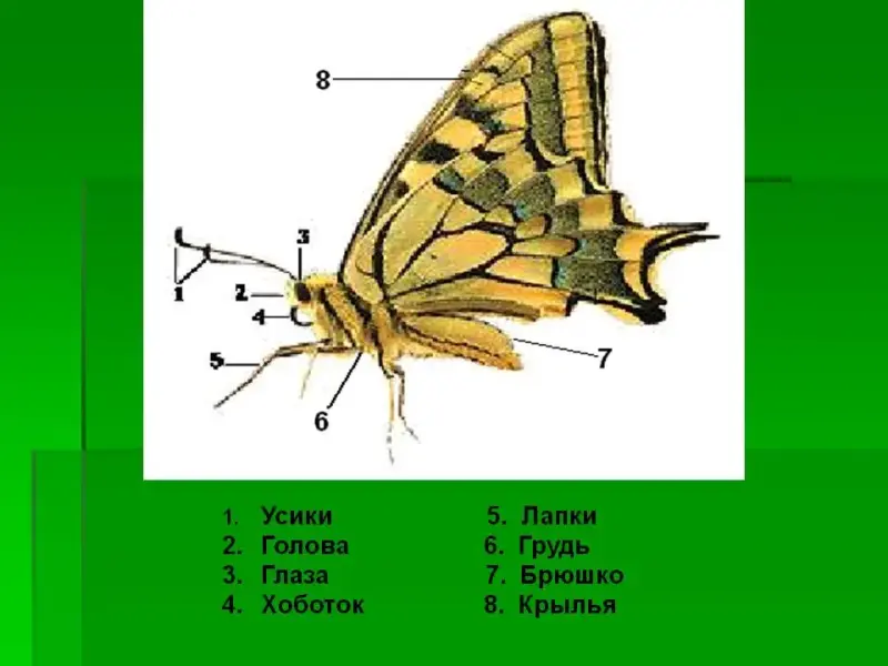 Дети находят у бабочки голову, грудь, брюшко, усики, глаза, хоботок, с помощью которого бабочка пьет нектар. На груди у бабочки крылья и ноги.