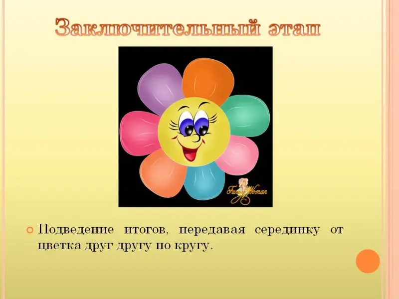 Когда отрывается последний лепесток, психолог говорит о том, что на нем написан вопрос: «В какие игры дети играли на занятии?» дети передают друг другу по кругу серединку от цветка и называют игры, в которые играли на занятии.