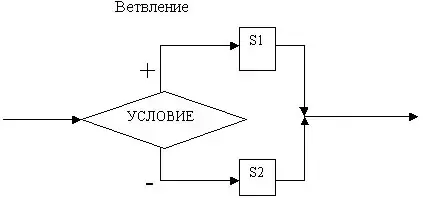 Ветвящийся тип алгоритма имеет более сложную структуру относительно линейного типа, так как в ветвях ветвления имеем и линейные блоки, в частности - это вспомогательные алгоритмы, но в любом случае - это сложный шаг алгоритма.